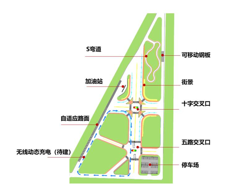 长城汽车“国家智能汽车与智慧交通(京冀)示范区”(以下简称示范区)是由工业和信息化部指导,长城汽车具体实施建设的国家级智能汽车与智慧交通应用示范项目。示范区一期工程为封闭测试区,位于长城汽车徐水试验场内,占地13.4万平方米,总投资6000余万元人民币。测试区新建测试道路总长度5公里,由十字路口、五岔路口、环岛及特殊路面组成,充分模拟城市及城郊交通工况。