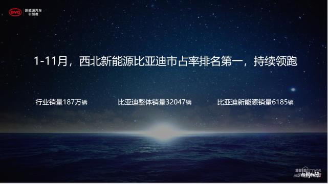 2019年1-11月,西北乘用车累计销售超187万辆,比亚迪整体销售超32047辆,其中比亚迪新能源车销售超6185辆,新能源市占率30.43%,保持第一,持续领跑。