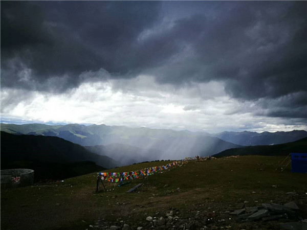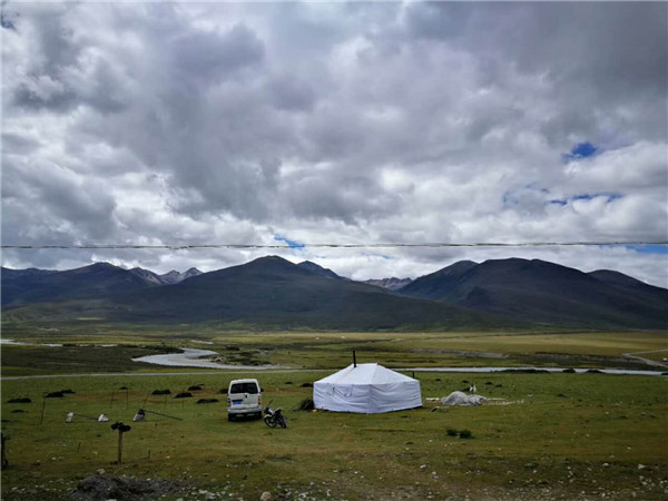 在禾日乡吃完午饭,前行不到10公里时,天空突然乌云密布,根据昨天的教训,我立即找躲雨的地方。路边恰好有几顶牧民的帐篷,正当我还在犹豫进不进去的时候,雨点倏忽间劈头盖脸落下来,我想都没想就推着自行车往帐篷里闯。