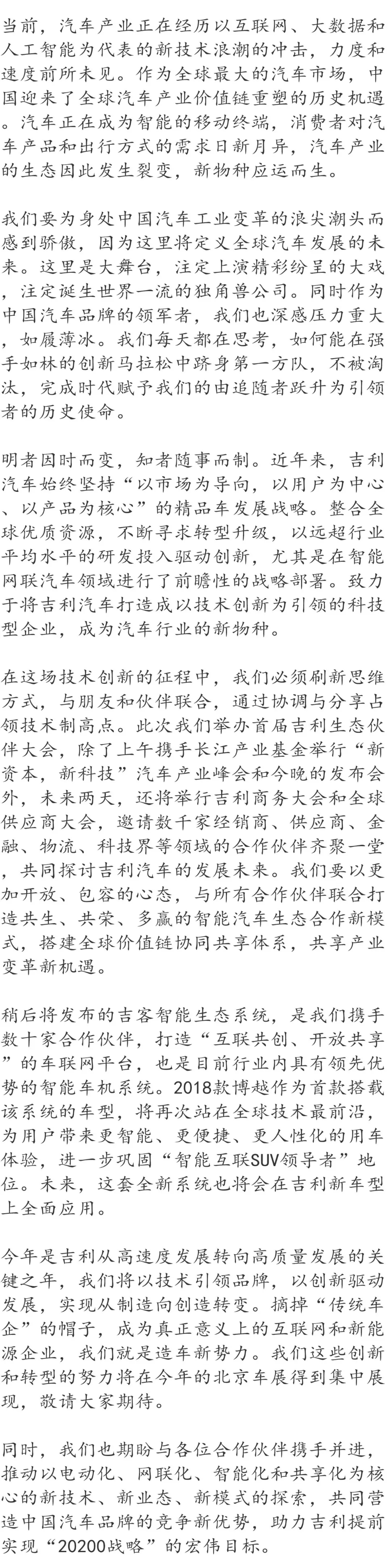 以下是安聪慧在吉客智能生态系统发布会暨2018款吉利博越上市会上的讲话(略有删减)