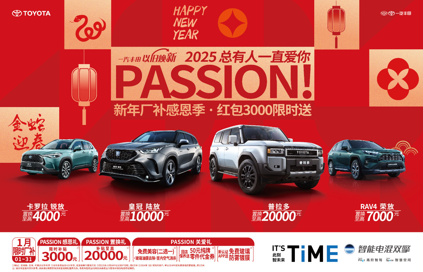 “时间会奖励认真做事的人”!2025年的一汽丰田也已诚意满满地为“认真”的每一位用户准备了1月的开年大礼,购车即享3000元限时红包,外加丰厚贴心关爱大礼,及至高2万元置换补贴,其中,刚刚上新的普拉多全能TX限时智享版实付仅需47.98万起。2025年的一汽丰田,如同新年的第一缕阳光,蓬勃而出,充满朝气,充满力量。