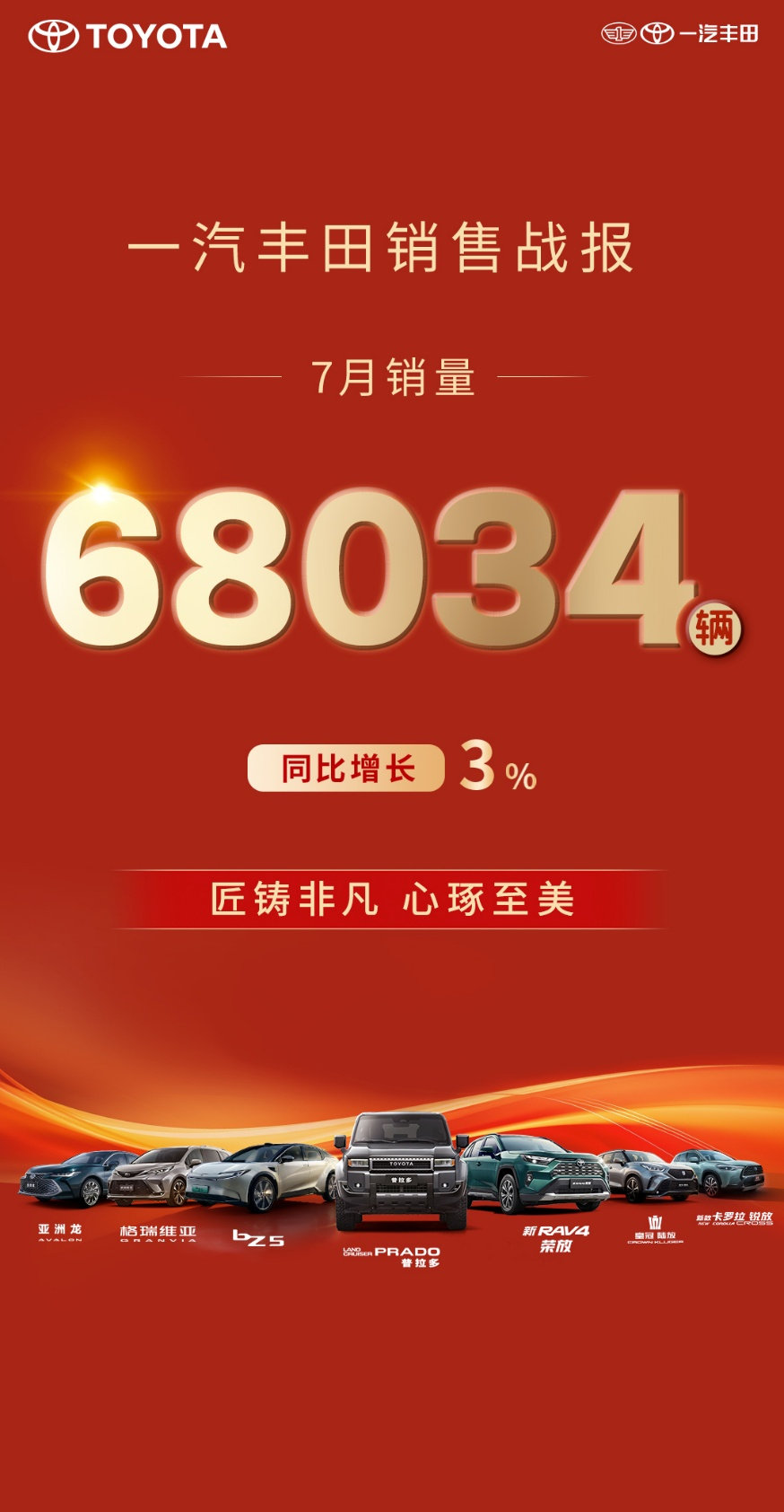 2025年8月1日,一汽丰田率先公布7月销售成绩;7月销售新车68034辆,同比增长3%,继上半年同比增长16%之后,再次将正增长时间记录拉长,说明其“合资新力量”的成色更足了。