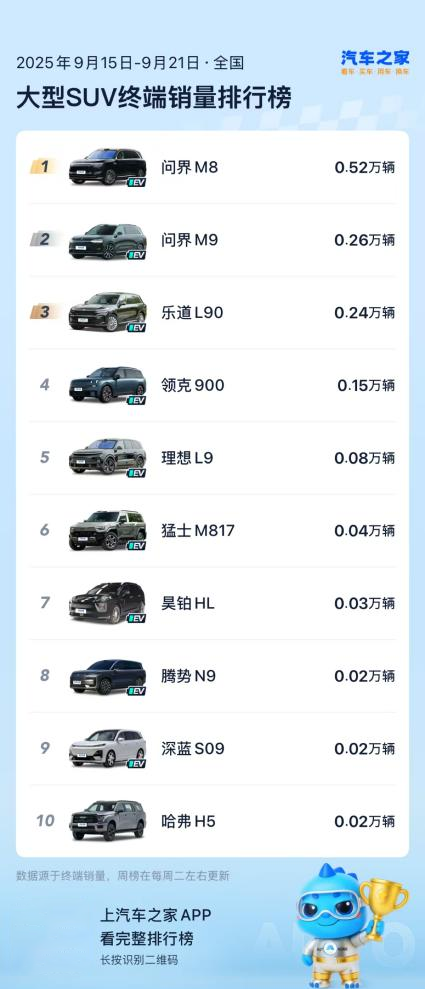 近日,汽车之家公布了2025年9月第三周(9月15日-21日)的终端销量数据,广汽昊铂HL位列大型SUV终端销量排行榜第七,领先于腾势N9、深蓝S09等同级热门车型。自8月19日上市后,昊铂HL增程版市场热度持续走高,这一“上市即上量”的表现,正是其“大满配”产品力的最佳印证。