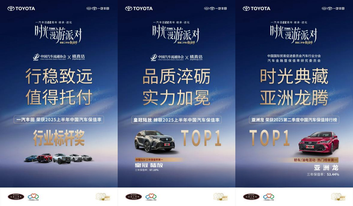 在中国汽车流通协会2025年上半年发布的保值率榜单中,一汽丰田荣获“中国汽车保值率行业标杆奖”。具体到车型,皇冠陆放在中型SUV保值率榜单中高居榜首,三年保值率达67.1%;亚洲龙则持续领跑中高级轿车及混动市场。