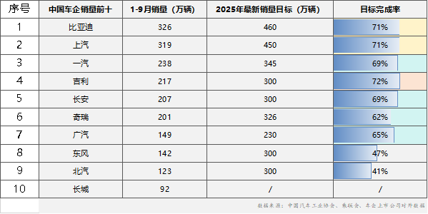 从销量前十车企的竞争格局来看,比亚迪与上汽集团共同占据第一梯队位置,1-9 月累计销量均突破 300 万辆。其中,比亚迪以 326 万辆的累计销量稳居行业榜首,已顺利完成其全年 460 万辆最新销量目标的 71%,凭借在新能源领域的技术优势与产品矩阵,持续巩固行业领先地位。上汽集团同期累计销量达 319万辆,全年目标完成率同样为 71%,在燃油车市场稳步推进、新能源车型加速布局的 “双线并行” 策略下,保持了稳健的增长节奏。