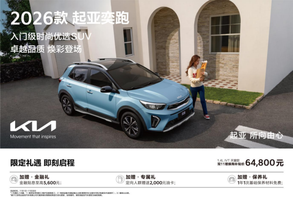 卓越品质,焕彩登场。11月1日,起亚全球高品质SUV——2026款起亚奕跑焕新上市,新车新增了天霜蓝外观配色和灰色内饰配色,共推出2款车型,其中1.4L IVT天窗款双11增换购补贴价仅64,800元。同时,购车用户还可享金融贴息至高5,600元、定向人群赠送2,000元油卡、1年1次基础保养材料免费等多项超值权益。