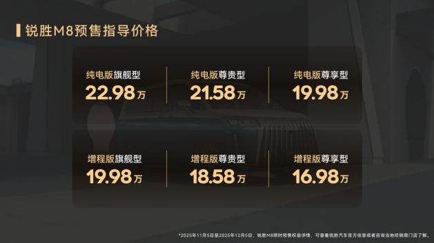 11月5日,作为北京汽车制造厂旗下专注MPV赛道的独立品牌锐胜M8开启预售。锐胜M8提供多种动力版本,预售价格分别为:锐胜M8-增程版169800元起,锐胜M8-EV版199800元起。全系车型拥有多场景适用与经济实用性,兼顾越级空间及丰富配置,尽享三排都是商务舱的奢适感,给出了大型MPV高质价比的新选择。