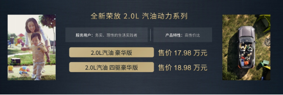 2.0L汽油动力系列面向的是务实、理性的生活实践者;他们信赖久经市场验证的成熟技术与丰田一贯的耐久品质。全新荣放提供了汽油动力的两驱和四驱两个版本;无论是专注城市通勤的豪华版,还是应对偶尔探险的四驱豪华版,全新荣放都将兑现对“高价值”的纯粹定义。全新荣放2.0L汽油豪华版,售价为17.98万元;全新荣放2.0L汽油四驱豪华版,售价为18.98万元。