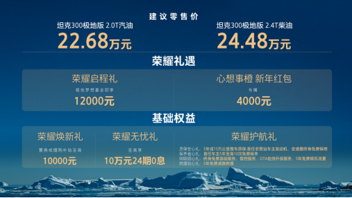 12月11日,在坦克300全球用户达成50万之际,坦克300极地版正式上市。官方建议零售价,坦克300极地版2.0T汽油22.68万元,坦克300极地版2.4T柴油24.48万元,并推出荣耀启程礼、心想事橙新年红包和多项基础权益等多重购车礼遇。