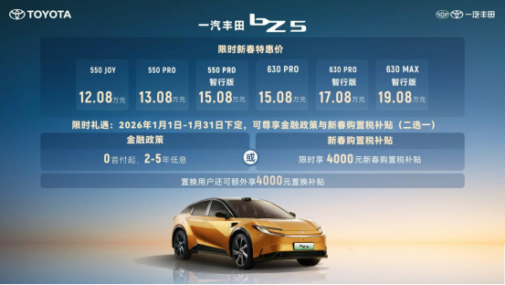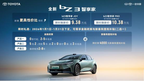 2025年12月31日,一汽丰田举办智电bZ双车焕新发布会;公布bZ3智享家 JOY版和bZ3智享家 PRO版限时焕新价分别为9.38万元和10.38万元。同时,在2026年1月1日-1月31日期间下定的用户,限时额外享4000元新春购置税补贴,或者包括0首付,2~5年低息;贷款5年,前两年0首付0息,后3年低息的“5免2”等在内的金融政策福利。