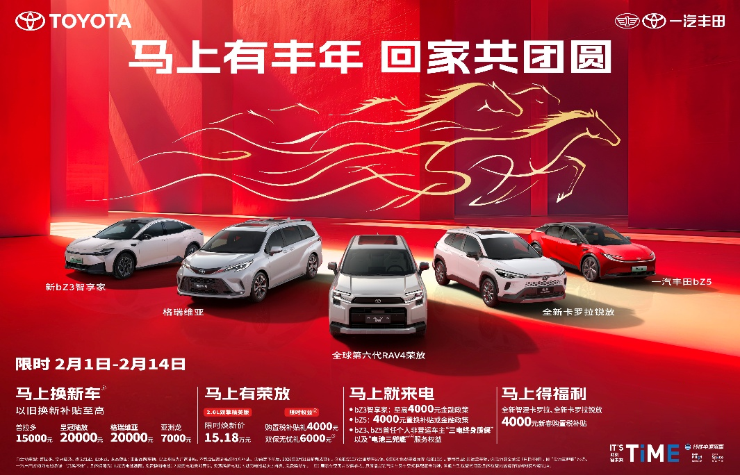年味渐浓,归途可期。一汽丰田以一份诚挚礼遇,守护每个家庭的团圆之旅。2月1日至2月14日,一汽丰田推出限时活动,皇冠陆放、格瑞维亚等明星车型享至高20000元的置换补贴;全新第六代荣放限时焕新价15.18万元起,并可享4000元的购置税补贴和6000元的双保无忧礼;纯电“双子星”bZ3智享家和bZ5至高享4000元购车补贴和“三电终身质保”“电池三兜底”的服务权益;全新智混卡罗拉、全新卡罗拉锐放也可享4000元新春购置税补贴。