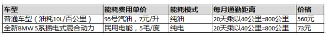 给这台车充满电大概需要11度电,按照0.5元每度电的价格,我们简单地做个计算题:假设一位社会精英,工作日每天城市通勤路程是40公里,那么他开一台普通车和开一辆全新BMW 5系插电式混合动力的能耗差异如下: