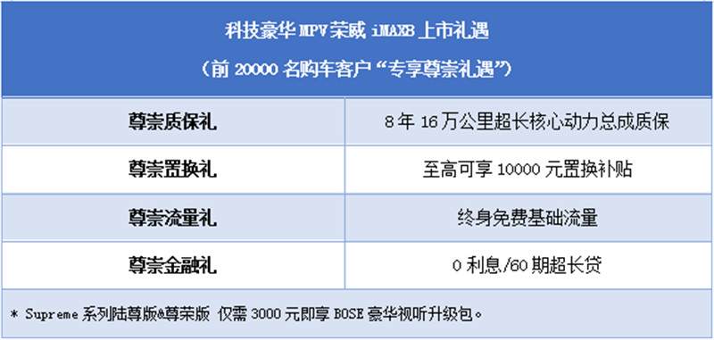 上汽荣威立足高端MPV细分市场发展趋势,为有爱、有为、有向往的国潮新赢家用户量身定制国潮MPV——荣威iMAX8。新车拥有让人一见倾心的“头部网红”高颜值设计、同级唯一的“三魔”配置、充沛的动力和极致舒适的驾乘体验,将以超越主流合资的水准,全方位满足用户对高品质MPV出行的所有需求。