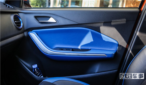 而它的内饰,则是突出了简洁的风格。以黑色和蓝色的拼色为主,在空调的出风口、车门板等处均运用了蓝色元素进行装饰,符合时下简约的设计风格,也衬托出其纯电动车型的身份。